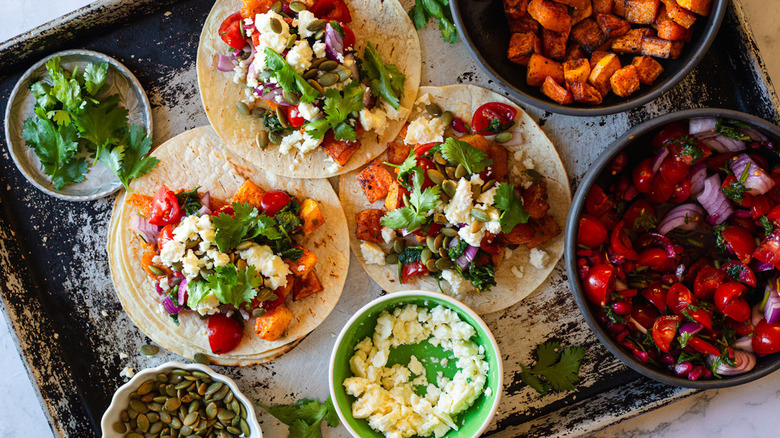 For those of you who are vegetarian — or, if you just like to enjoy vegetarian meals — then you're probably always on the lookout for ways to upgrade your dishes and keep them exciting. Well, we have just the way to take your veggie tacos to the next level: pomegranate seeds. In Tasting Table's recipe for butternut squash tacos with pomegranate pico, which was developed by Ksenia Prints, we mix pomegranate seeds with cherry tomatoes, red onion, and cilantro, as well as salt and pepper, to make a delicious take on pico de gallo.