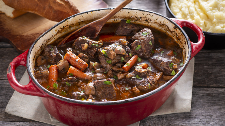Cozy beef dishes like a traditional stew or braised brisket make wonderful dinners when the temperature dips. When you put that pot on the stove, however, keep an eye on the liquid and always adjust the heat to avoid boiling for the best flavor and texture. It might be tempting to turn up the heat thinking dinner will be on the table sooner, but the higher heat of boiling can make beef stringy and dry.
