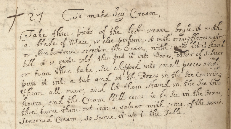 But if we use the modern definition of "ice cream" — a cream-based frozen dessert — we need to look to England during the Stuart Era and into a memoir written in the 1660s by an Englishwoman named Lady Anne Fanshawe. In it, she mentioned a recipe for a treat called "Icy Cream." Specifically, she wrote: "Take three pints of the best cream, boil it with a blade of mace, or perfume it with orange flower water or ambergris, sweeten the cream with sugar." This mixture was then placed in a tin or silver container, covered with ice, and left to chill for two hours, resulting in a container full of "Icy Cream."