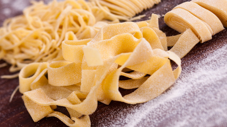 We're here to tell you that this is a mistake. We suggest adding starchy potatoes to your soup, the type that will break down in the broth and infuse the whole thing with its natural thickening properties. Good options for this are russet or Idaho potatoes. If no fresh potatoes are available, or if you want to use up some leftovers, you can achieve a similarly creamy effect by adding mashed potatoes, potato flakes, or hash browns — all of which will break down and spread throughout your soup. Alternatively, if you want to have your cake and eat it too, you can populate your chicken noodle soup with durum wheat noodles instead. Their high gluten content will ensure that the durum's starch will break down into your soup as you cook the noodles, even while they maintain their shape and chewiness.