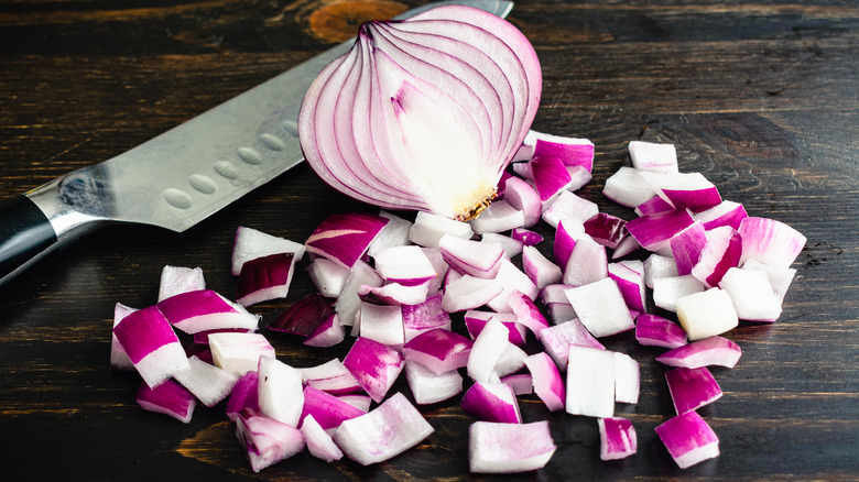 And speaking of structure, home cook Michael Tchao shared his technique of cutting an onion along (rather than against) its grain to preserve more of its fibers in an Instagram post. This means slicing it lengthwise, or from tip to root, instead of crosswise. While this is more about retaining the onion's crunch and texture for certain dishes and cooking methods, keeping its structure as intact as possible also decreases the possibility of waterworks.