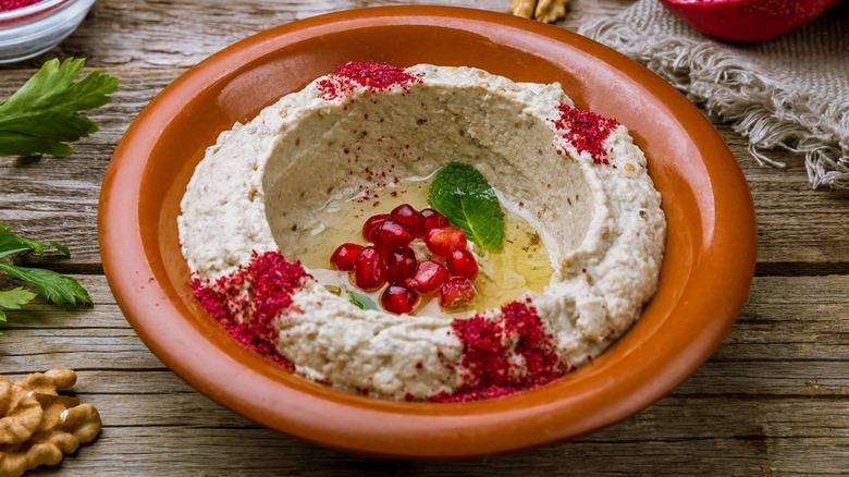 For another alternative to hummus on a Mediterranean or Middle Eastern-inspired charcuterie board, try baba ghanoush or mutabal instead. Baba ghanoush and mutabal are made from roasted eggplant and are similar spreads. The main difference is mutabal tends to add yogurt, whereas baba ganoush does not. There are other minor differences depending on region and personal preferences. While the tahini paste in both dips is reminiscent of hummus, the flavor of charred eggplant gives it a much deeper, richer, and smokier profile overall.