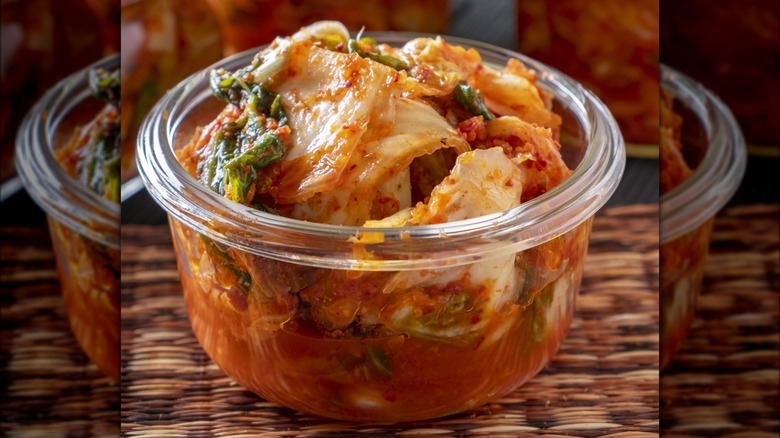 There are many types of kimchi, but the jarred options you can find in the international food aisle of your local grocery store usually include a fermented formula of cabbage, green onions, and other vegetables alongside various spices, alliums, and gochugaru (a type of powdered red chili pepper). Its biggest benefit is its powerful probiotic properties. So, not only is it good for your gut, but its flavor is also undeniably delicious. Kimchi's tangy flavor notes could easily replace the sourness that pickles provide with the added surprise of spice.