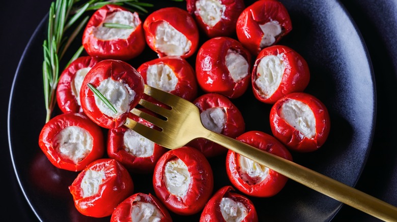 If you aren't familiar with cherry peppers, you should be able to find this ingredient at the grocery store in the same aisle as pickles. Due to their tough skin, cherry peppers are typically only eaten pickled, so you'd be hard-pressed to find fresh ones. While similar to pimentos, cherry peppers are slightly spicier — and perfect for making bite-stuffed peppers to give your charcuterie board a pop of color and a burst of zing.