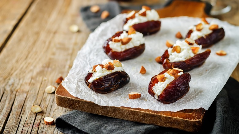 Dates are a wonderfully versatile dried fruit that we think you should always have in your kitchen. The sweet fruit of the date palm boasts a wide range of culinary uses, from sweetening smoothies to starring in appetizers like bacon-wrapped dates. While dates can certainly go solo on a charcuterie board, we suggest jazzing them up a bit by stuffing them. Goat cheese makes a heavenly pairing with dates; slicing the dates open, removing the pits, and filling them with tangy goat cheese is one quick and easy way to elevate this ingredient for your charcuterie board.