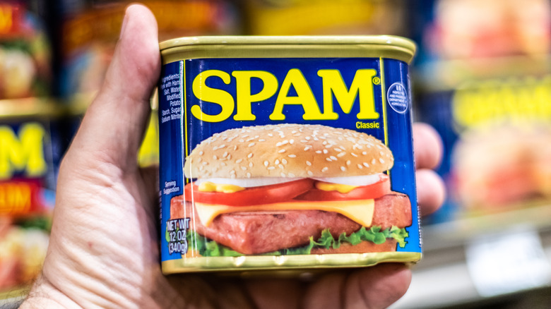 Whether you're enjoying Spam musubi or making Spam fried rice, one of the most difficult parts of using this canned meat is the can itself. Spam is tightly packed into its metal tin to help preserve the meat and keep it shelf stable. But this powerful vacuum seal wedges the Spam so tightly into the can that it can feel impossible to get out. More often than not, you want to keep the Spam whole and intact for your recipes so you can cut and shape it to your liking, but difficulty removing the Spam can lead to accidentally ruining its original shape. Luckily, next time you open a can, you don't have to suffer when trying to get your Spam out.