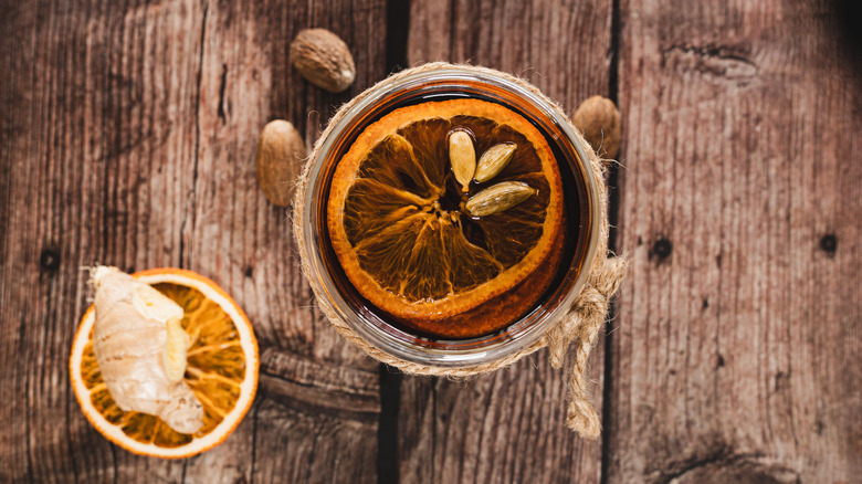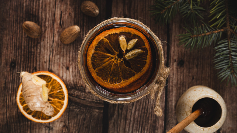 To create this comforting winter warmer, you will need mead, brandy, and whole spices including allspice and cloves. In that same thread, you'll also need cardamom pods for both flavoring the drink and garnishing each serving, a fresh knob of ginger to lend its warming properties, cinnamon stick for its familiar winter flavor, and freshly grated nutmeg. Fresh orange juice will provide bright citrus notes, honey will balance the ingredients with subtle sweetness, and dried orange slices make for the perfect final garnish.