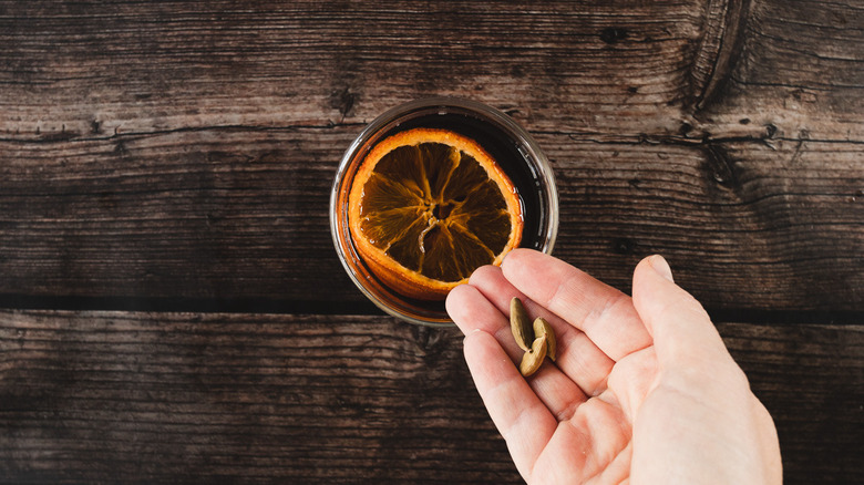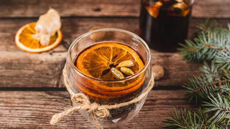 - Garnish each glass with a dried orange slice and the remaining cardamom pods, then serve.