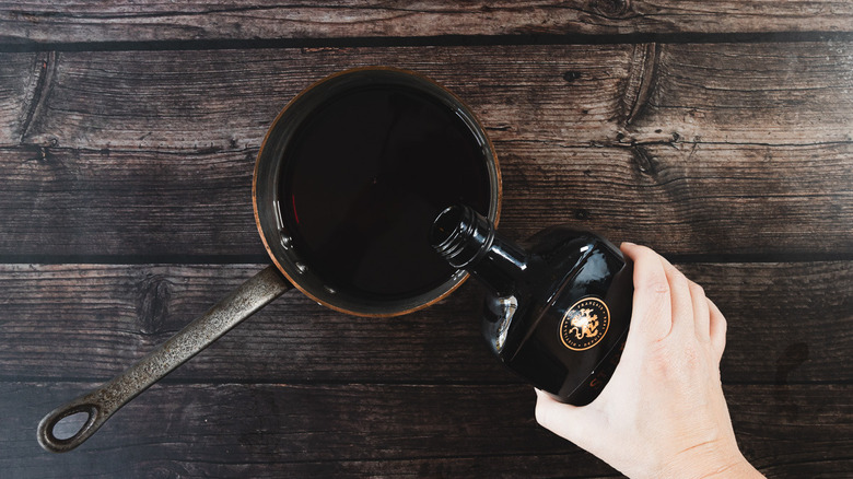 - Pour the mead and brandy to a large pot.