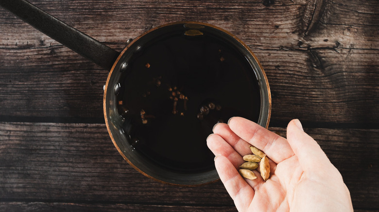 - Add the allspice, cloves, and 4 cardamom pods.