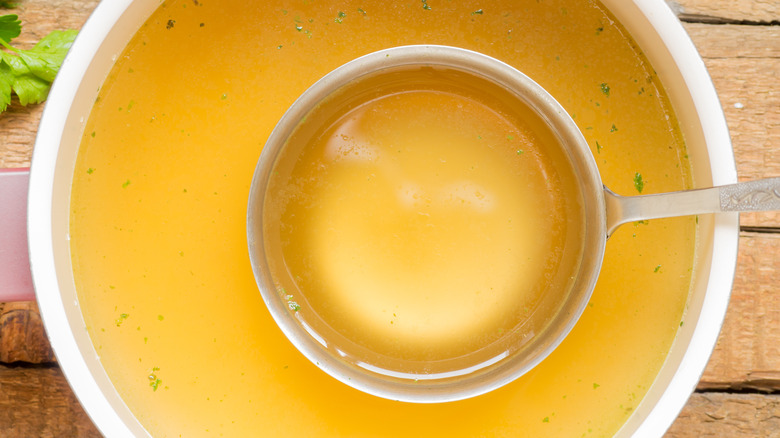 When we want to upgrade the taste of store-bought gravy mix, rice, or instant mashed potatoes, we turn to broth instead of water. Unlike the latter, broth is typically cooked in a mixture of ingredients (including garlic, onion, thyme, peppercorns, bay leaves, and often a protein like chicken or beef) that give the liquid a ton of flavor, and its thin consistency means it can easily serve as a water replacement when cooking. So, if you want to add all those aromatic, savory flavorings into your vegetables, try sauteing them in broth instead of oil or butter.