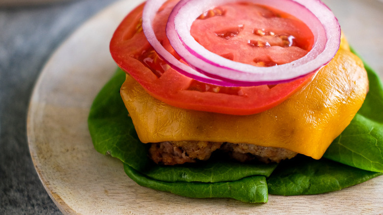 Turkey burger lettuce wraps can be a delicious, healthy substitute for your traditional burgers. Plus you don't need to fire up the grill for these patties since the turkey burgers are baked. However, if you're someone who loves the charred smokey flavor that grilled meat offers, the prospect of a baked burger may seem lackluster. This is where liquid smoke comes in. This ingredient offers a hint of umami, smokiness and captures that addictive charred flavor from the grill. Tasting Table recipe developer Chanel Murphy-Lowe uses liquid smoke as the secret ingredient in her recipe for turkey burger lettuce wraps to give her burgers a greater depth of flavor. "It adds a smoky flavor to the burgers, mimicking the taste of grilling. It's not a common ingredient in all turkey burger recipes, so it gives this one a distinct flavor profile," Murphy-Lowe explains.