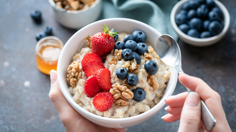 Elevate your oatmeal with an egg, and add the beaten egg to the mixture after it has cooked on the stovetop with your liquid of choice for about seven minutes. You'll need to keep stirring the oatmeal as the eggs cook because it will force the proteins to bond to the oats rather than stick to the sides of the pan.