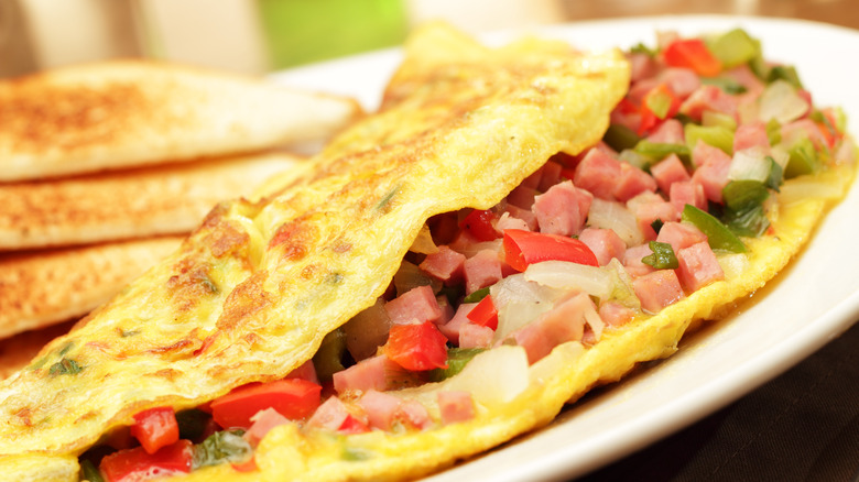 The cooked fillings, like peppers, ham, bacon, and onion, will steam up and melt your cheese perfectly. Plus, you won't have to worry about biting into a raw vegetable when it comes time to eat breakfast. Alternatively, you can mix the cheese into your toppings as they're cooking to ensure it melts perfectly, without having to worry about overcooking your eggs.