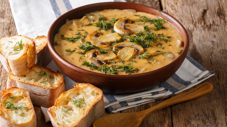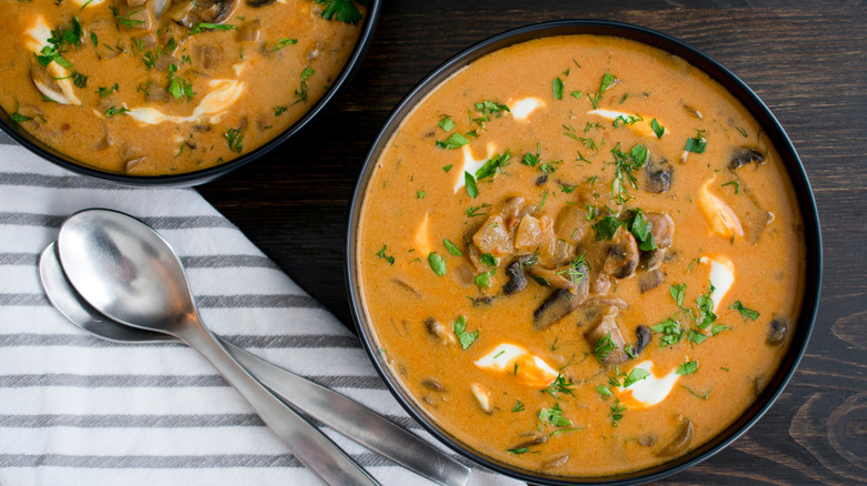 Traditional ingredients found in Hungarian food include, perhaps most notably, paprika, dill, sour cream, onion, garlic, parsley, and meat. While you're likely to find all of these in the country's most famous dish, goulash, there are plenty of other options to fix your taste buds on that incorporate these famous flavors, including our warming Hungarian mushroom soup. For this soup, recipe developer Miriam Hahn made sure to focus on all of the classic Hungarian profiles. "I recently traveled to Hungary and had the opportunity to taste many delicious Hungarian dishes," Hahn explains. "This mushroom soup was one of my favorites, so of course I wanted to recreate it in my kitchen. I couldn't help but come home with a huge supply of paprika, as it was showcased everywhere, and it gives this soup a slightly sweet and earthy flavor."