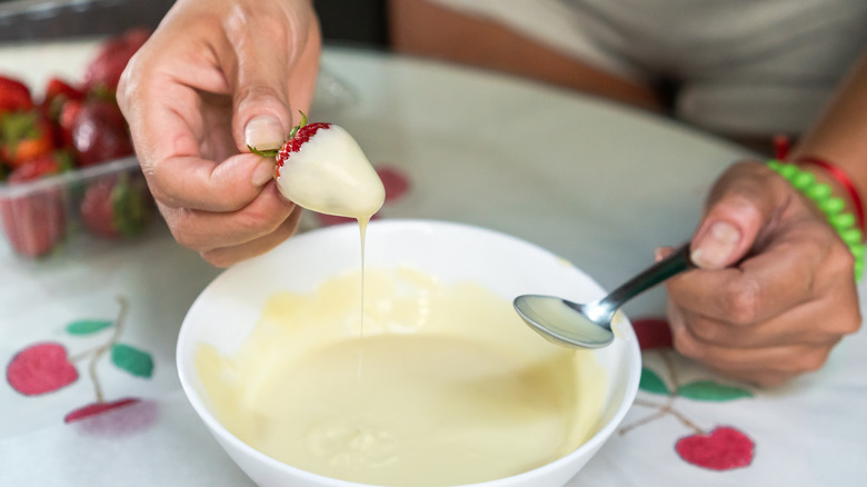 Tis the season to get creative and chocolate-covered strawberries provide you with the perfect culinary canvas to do just that. You can transform these sweet fruits into a yummy, edible, and colorful string of Christmas tree light bulbs with just a few extra ingredients and steps. Instead of milk or dark chocolate, use melted white chocolate and your favorite food dyes to create the colorful "bulbs." Use white and blue for a Frozen theme or go the more traditional route and color your chocolate all the primary and secondary colors. You can even give them a dusting of edible gold or silver edible glitter for a little shimmer and shine.