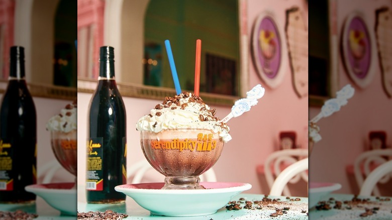 The famous frozen hot chocolate is something of a milkshake slushie hybrid, topped with drizzled chocolate and a huge swirl of cream. While Serendipity's Frrrozen Hot Chocolate isn't technically a milkshake, it's reasonable to consider that a chilled, drinkable chocolate can fall under the same umbrella.