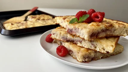 Making pancakes in a pan can be pretty time-consuming, to the point where the cook may have to eat cold leftovers by the time they're done feeding everyone else. With this recipe from developer Tess Le Moing, however, you can make one big pancake (with a pretty jammy swirl, to boot) in a sheet pan, something that she tells us "allows you to make a large batch of pancakes all at once [and] saves you time when cooking for a crowd."