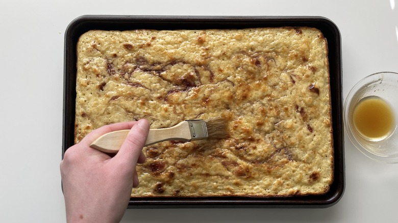 Let the baked pancake cool for 5 minutes before brushing with maple butter.