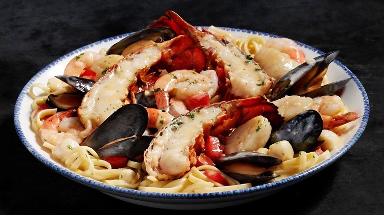 It all starts with petite Maine lobster tails, which are served with shrimp, mussels, bay scallops, and tomatoes. All of that shellfish is served on a bed of linguine, which is dressed with a lovely, light white wine broth. Aren't you drooling already? We love this dish because it's filling, it's flavorful, and ultimately, it's simple. Great seafood shines all on its own, and with this dish, Red Lobster allows it to take center stage.