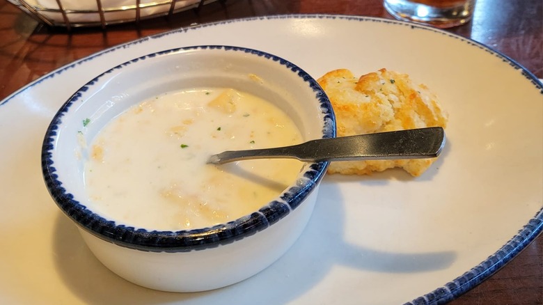 You may assume that Red Lobster's New England Clam Chowder wouldn't be that good, but in reality, it's actually not that bad. They certainly don't skimp on the clams, which is a blessing — clam chowder that doesn't contain enough clams is almost guaranteed to be a letdown. It's creamy, and it has a rich, seafood-y broth that complements the other ingredients nicely. This soup is certainly a step up from the stuff you'd get in a can.