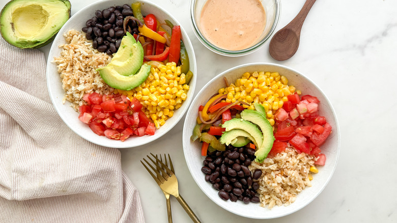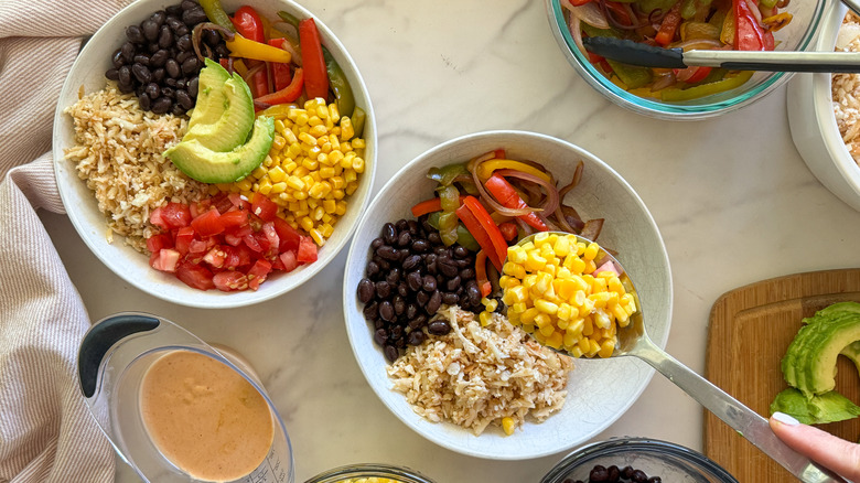- Assemble the bowls by adding the cauliflower rice, black beans, peppers mixture, corn, tomatoes, and avocado.