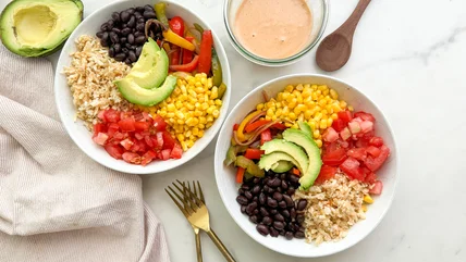 Customizing cauliflower rice burrito bowls allows you to tailor the dish to your taste preferences and dietary needs. To start, you can leave the cauliflower rice plain or season it differently. Lime juice, salt, and minced cilantro will add good flavor and is a simplified way to make the rice. We're using black beans as our protein source here, but you can switch that up by using grilled chicken, beef, shrimp, tofu, pinto beans, or a combination for a mix of flavors and textures.