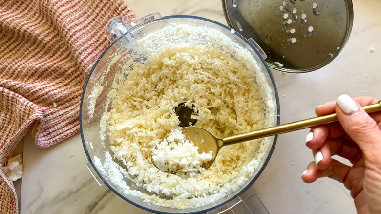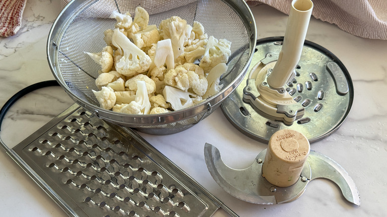 - Using the grating blade on a food processor, process the cauliflower into cauliflower rice.