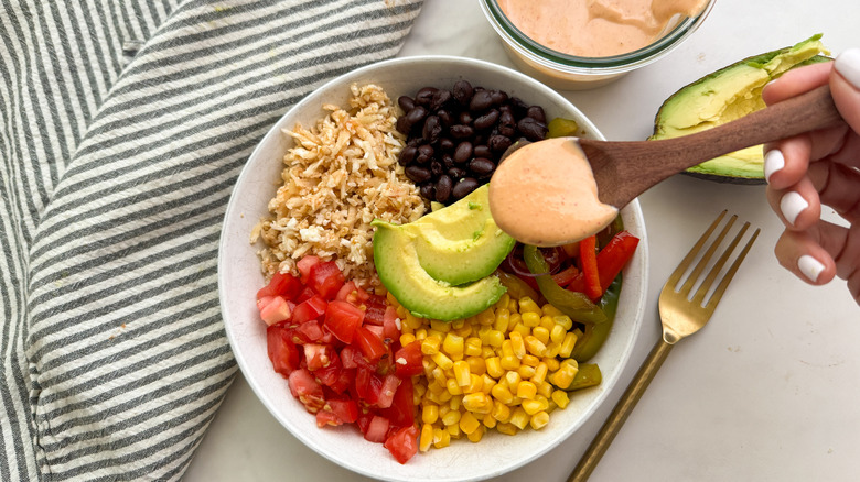 - Drizzle on the sauce or serve on the side. The cauliflower rice burrito bowls are ready to serve. Top with cilantro, jalapeño, and lime wedges if desired.