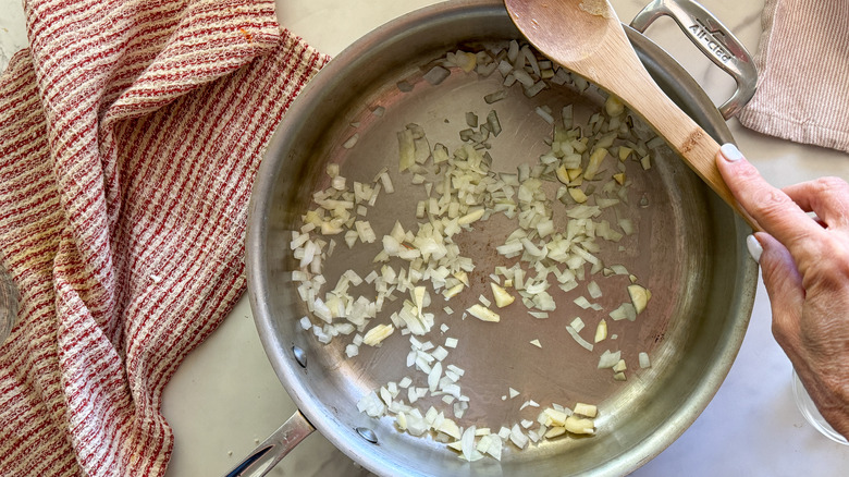 - Add the onion and garlic and saute for 2 minutes.