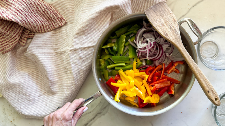 - Add the sliced red onion, red, green, and yellow peppers. Cook for 10-15 minutes, stirring frequently until soft.