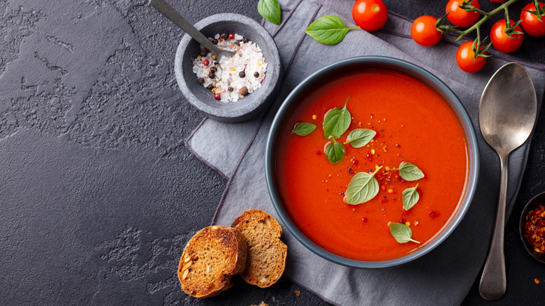 Soup and hot weather are two words that you usually don't hear in the same sentence — after all, not only does soup bring in the heat temperature-wise, but it also involves cranking up the stove. In order to combat those soup cravings on sweltering days, Spain (quite ingeniously, actually), came up with the idea of gazpacho, a cold, refreshing soup made from a blend of pureed vegetables. Gazpacho is a festive, flavorful dish best served bursting with the fresh tomatoes of August — there's just something about this liquid salad's vibrant scarlet hue that tastes like summer in a bowl.