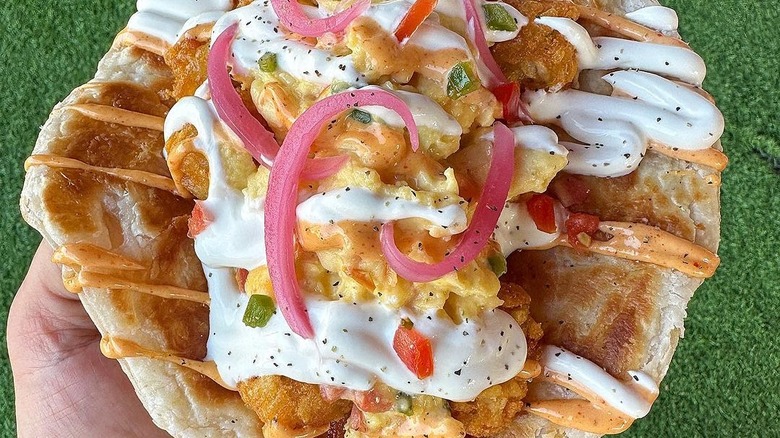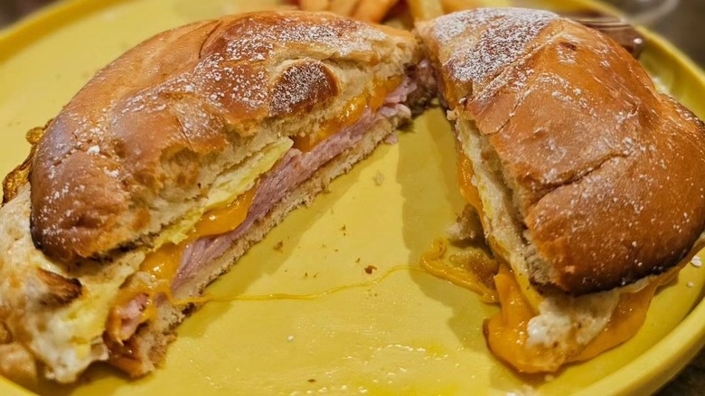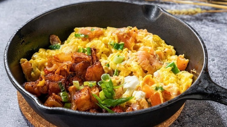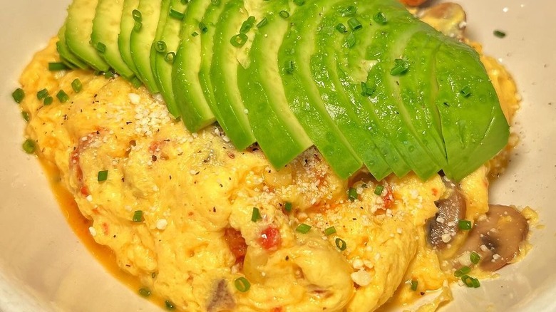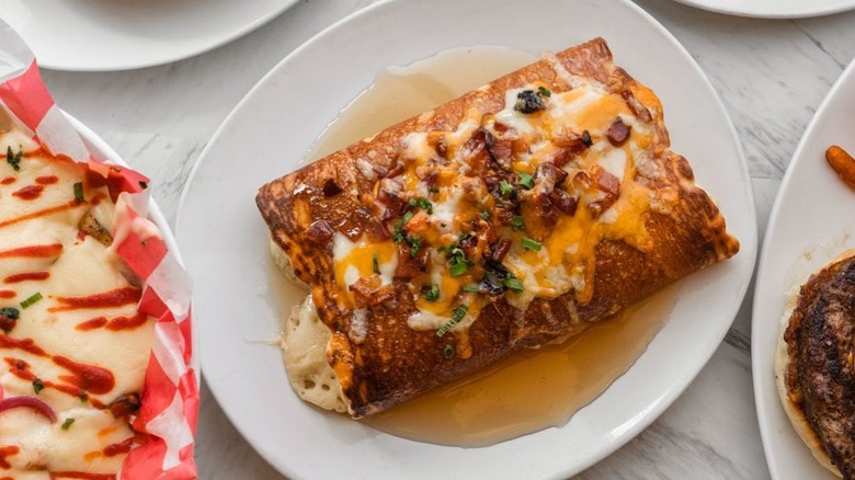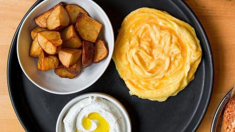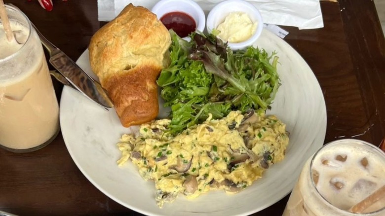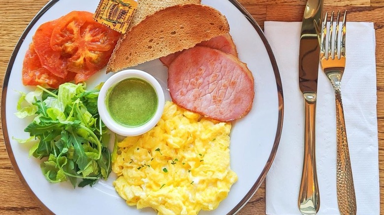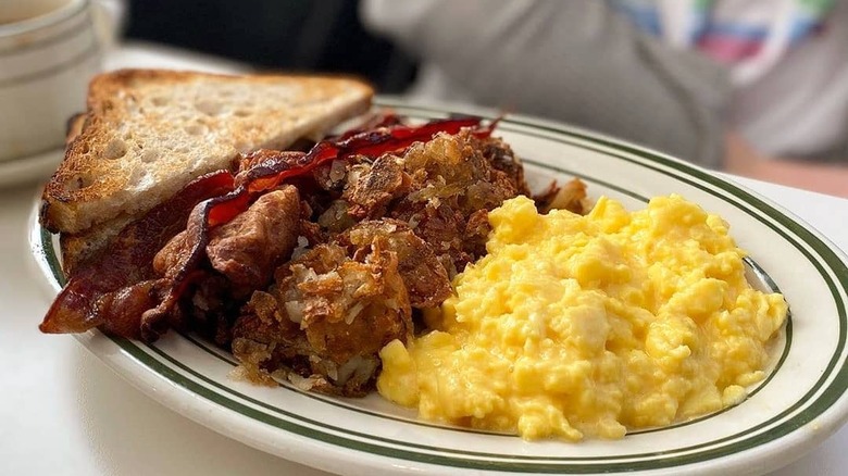 While dining inside the restaurant's cozy farmhouse-style space, you can also order one of the egg skillets served with homefries and featuring a variety of mix-ins. If you can't decide, the Working Farmer includes a variety of meats, vegetables, and cheeses for a little bit of everything. Another great option is the Southwestern twist on scrambled eggs — a tortilla filled with cheesy eggs, sour cream, and guacamole. Lines can get long, so it's best to make a reservation in advance.