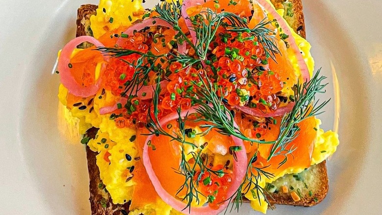 On weekdays, order a plate of the Ranchero Scramble topped with all of your Mexican-inspired favorite flavors like beans, avocado, cheese, salsa verde, and jalapeños. For weekend brunch, the iconic smoked salmon toast is a must-order. The crispy brioche toast is elegantly layered with salmon caviar, scallion cream cheese, and everything spice for an Instagram-worthy dish. If you're looking for something more straightforward, order any of the four steak and egg combinations, and request the eggs served scrambled instead of sunny side up.