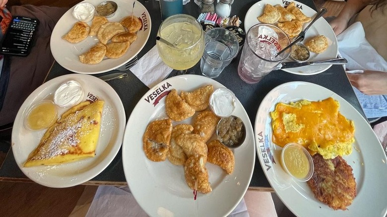 For a basic breakfast, Veselka offers a platter of two scrambled eggs with kasha, potato pancake, or tomato and challah bread or toast. Or, opt for the homemade corned beef hash with two scrambled eggs. If you want your scrambled eggs and pierogies, too, Veselka offers a breakfast special with both and a side of meat and salad. Perhaps the most unique dish, though, is the brunch pierogi — a bacon, egg, cheese, and potato-stuffed dumpling.