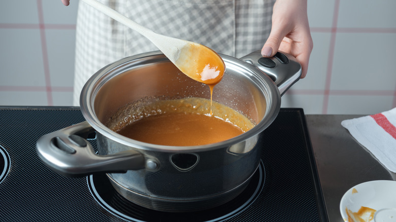 No matter what you're making, having the right tools is always critical for a smooth process. One of the most crucial tips out there for making a successful caramel sauce is to use the right pan. Choosing any old pan from your kitchen is the first way you can go wrong with this delicate sauce. First and foremost, choose a pan that's as heavy-bottomed as possible. A thin pan will cause a loss of control over how quickly the sugar heats, oftentimes resulting in a burned caramel. Meanwhile, a thick bottom holds steady and guarantees that heat is distributed evenly throughout the sugar mixture.