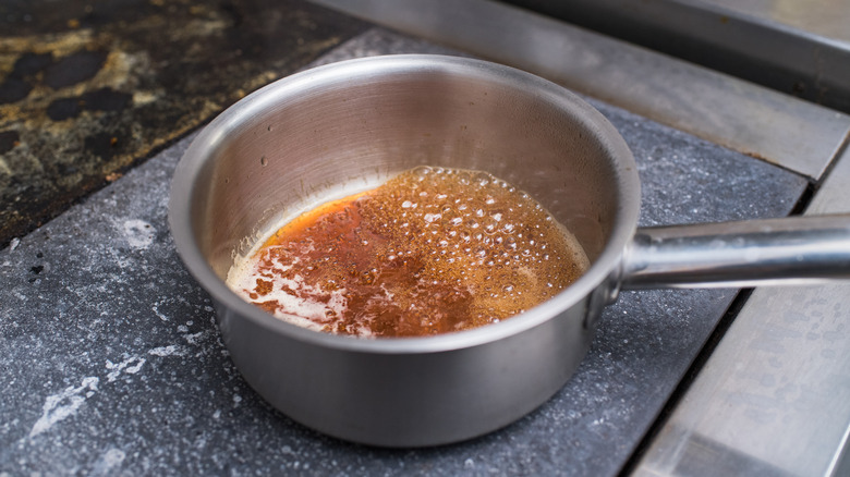 As soon as you have achieved your desired caramel shade, remove the saucepan from the heat as quickly as possible. If it hasn't been reiterated enough, the line between a successful caramel and a burned one is a fine one. It may seem contradictory to the prior tip of allowing your caramel to darken, but these two steps actually go hand-in-hand. Even though the caramel won't keep darkening after the heat is turned off, you don't want to take your chances — keep the saucepan away from and off the still-warm stove, even once it's been turned off.