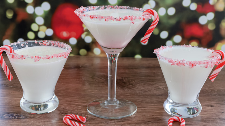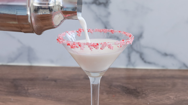 "You can definitely make a larger batch of these," Morone confirms. "Instead of adding the ice and using a shaker, you can just increase the recipe, put everything in a pitcher, mix it up, and keep it in the fridge until you are ready to pour these." You'll still have to garnish each glass individually, but that's a step you can do before your guests arrive so that the martinis are ready to pour. "You can also decorate the glasses in advance. Once the crushed peppermints are on the rim of the glass, they should stay," Morone says.
