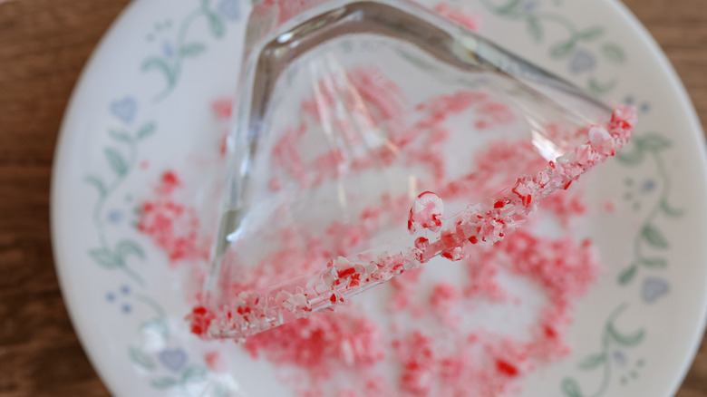 - Dip two martini glasses into the simple syrup and then into the crushed candy canes until coated.