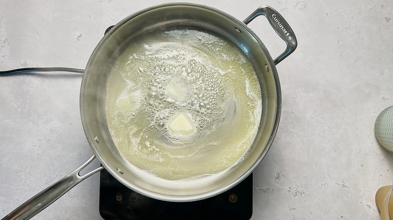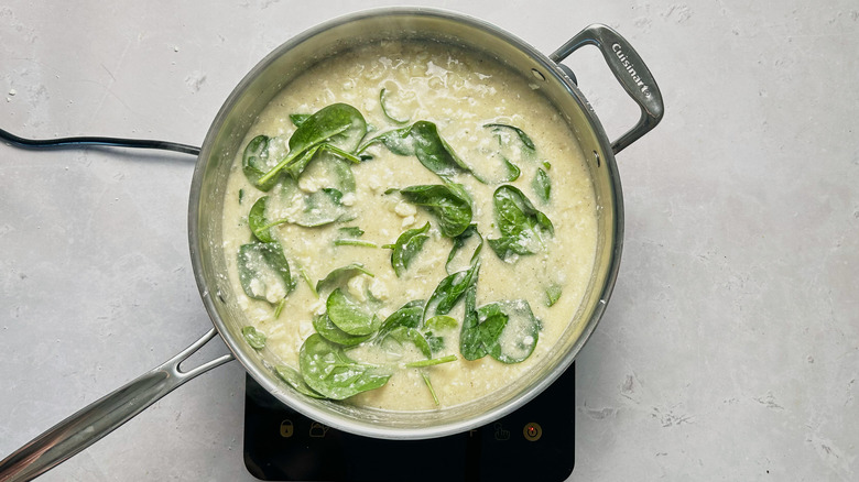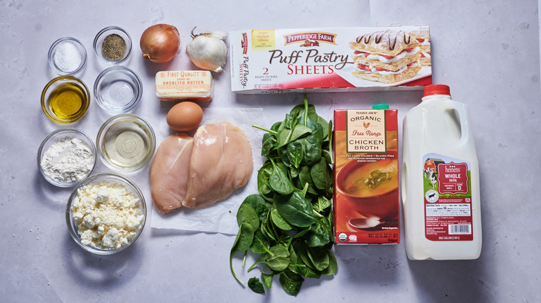 You'll need a few pantry staples for this recipe, including olive oil, salt, pepper, butter, flour, egg, and water. From there, you'll want chicken breasts (thighs will work too), onion, garlic, white wine, chicken broth, crumbled feta, milk, baby spinach, and a puff pastry sheet. You can always whip up a homemade pie crust or use leftover dough from previous pie recipes, but to keep it simple, McGlinn suggests opting for the frozen puff pastry sheets.