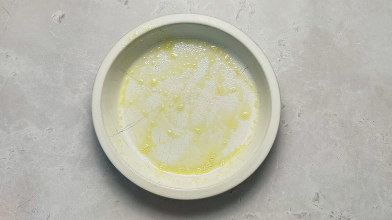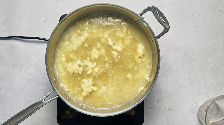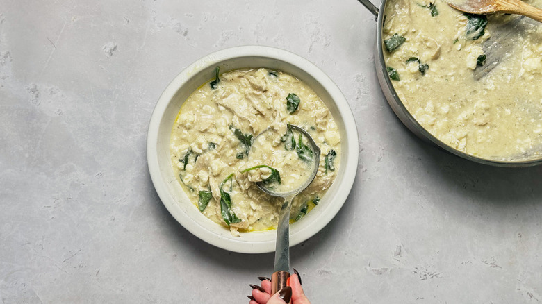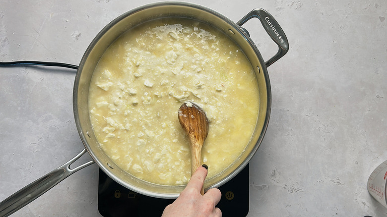 When the filling is in the skillet, it should be thicker than soup, but still runny enough to slide into the pie tin. After baking, the mixture will have thickened slightly into a consistency similar to pudding. Because there's no bottom crust, the pie won't hold together like a typical pie, and the best way to serve this is to allow the pie to cool and thicken a little bit further. The reason it thickens as it cools is because of the fats in the filling: The butter, flour, and cheese mixture solidifies as it cools (and when chilled, it will be almost completely solid, though not as appetizing). By letting the pie cool before serving, you'll avoid a soupy plate of pie filling. When ready to serve, it will be easy to slice as you would a pie, reinforcing the bottom with a spatula.