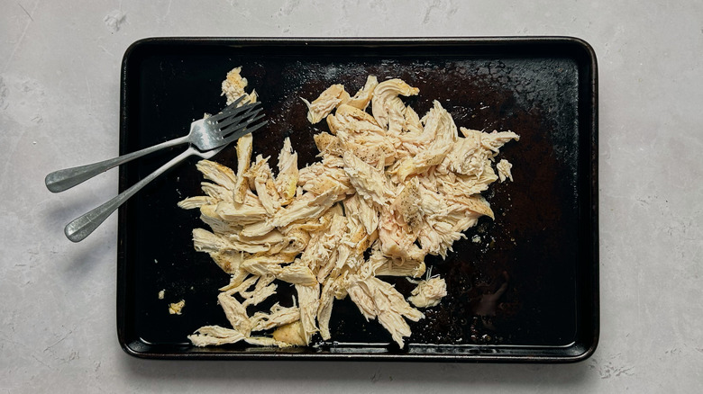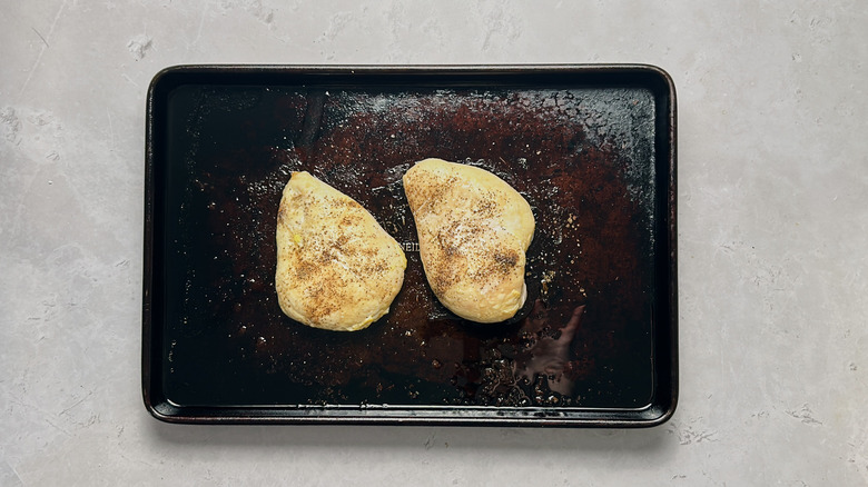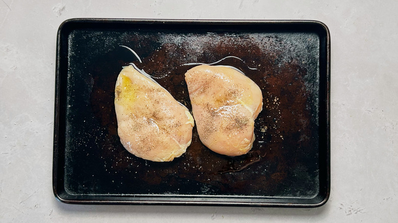 - Place chicken on a sheet tray. Coat with oil, then season with 1 teaspoon each salt and pepper.