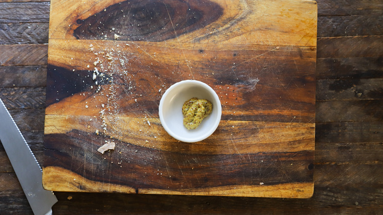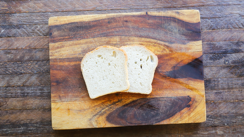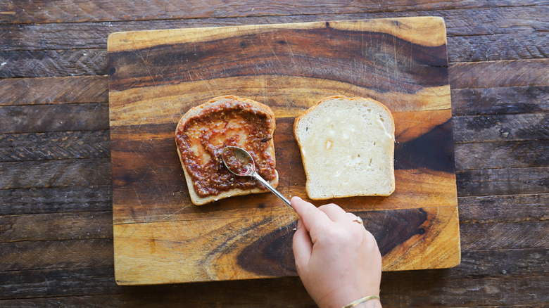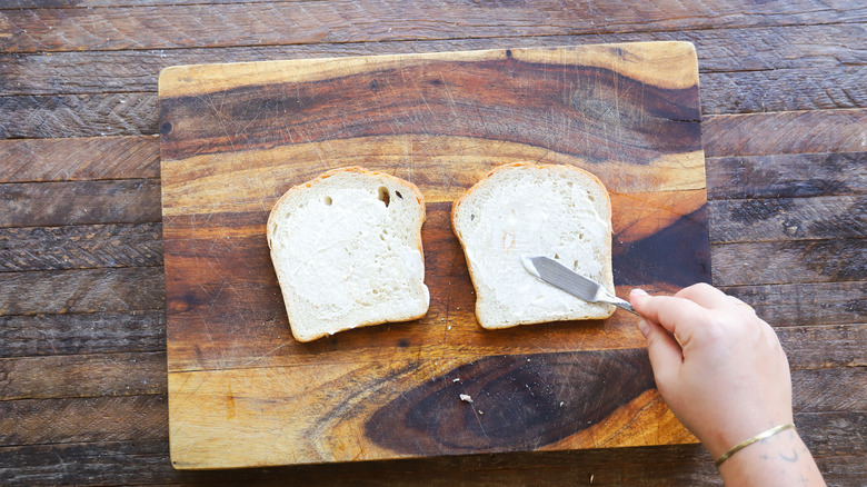 Whether you are using leftover roasted turkey or cooking some from scratch, you'll need a few ounces, sliced and reheated, to start this recipe. You'll also need some warm turkey gravy and cranberry sauce. Two slices of sourdough sandwich bread will anchor this sandwich, as well as a combination of mayonnaise and grainy deli mustard.