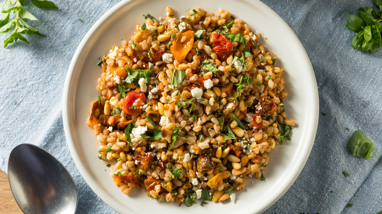 From its origins in China, rice has become a staple all over the world, but farro remains more tied to the flavors of its birthplace. It can find a home in many Mediterranean dishes, but it's most associated with Italy. Filling, nutty farro is used in Italian soups, where it can add whole-wheat goodness to a sausage and kale soup, or transform tomato soup into more of a full meal. It can also be served cold as part of a salad. It's especially tasty with a caprese, where it brings hearty flavors to an otherwise fresh, light dish. Farro is probably most popular as a basis for Mediterranean-inspired grain bowls. Top it with sauteed mushrooms and greens, or toss it with dressing, olives, feta, and crunchy fresh veggies.