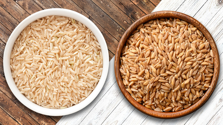 With ingredients like wild rice, amaranth, and farro popping up on menus and in stores everywhere, it's hard to deny there are a lot of grains around these days. This is a great thing overall, as these grains are both flavorful and nutritious while bringing a satisfying diversity to meals and recipes. Yet with any proliferation of newly introduced foods, they are also bound to create some confusion. Amaranth may have a long history of feeding people in the Americas, but how many people today would know what they're getting when they order it? It also doesn't help that some of these grains look alike, and share similar flavors and cooking methods. This is especially true of farro and brown rice, two products with pretty different origins and histories that can be easy to confuse with each other once cooked.