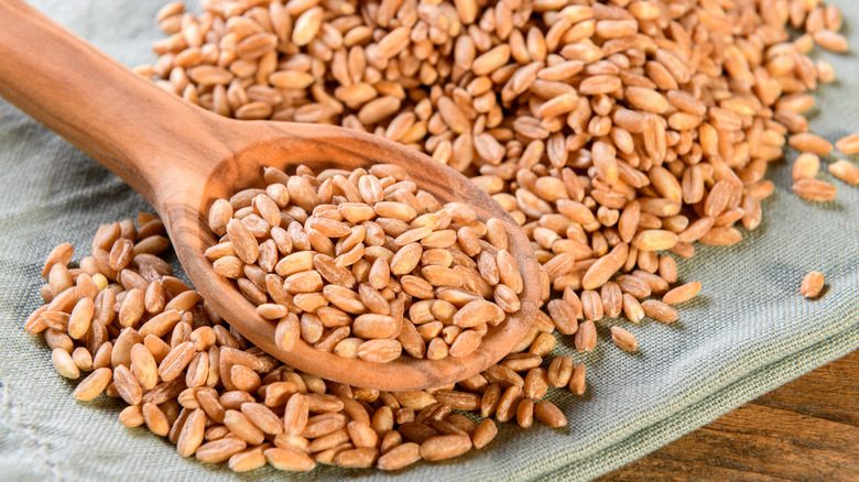 There are three types of commercially sold farro: Whole, semi-pearled, and pearled. Whole farro retains the grain's entire bran, where most of the wheat's fiber is stored. Semi-pearled has part of the bran removed, and pearled has no bran at all. The more bran farro has, the more nutrients it will have, but it will also take longer to cook. Whole farro is so hard that it's recommended to soak it overnight before cooking. In the U.S., it's usually pearled farro that's available in stores although it's not always clearly labeled. It's cooked similarly to rice, by being boiled in water, usually at a water-to-farro ratio of 2:1.