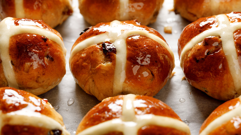 Tiramisu is an easy, no-bake, crowd-pleasing dessert. The name translates from Italian to "pick me up," referring to the coffee-soaked ladyfingers that separate layers of mascarpone custard. The pillar-shaped sponge cookies are traditionally used because they absorb the coffee beautifully while maintaining their form. But for an equally absorbent yet more flavorful twist on a classic tiramisu, you can swap the ladyfingers for hot cross buns. An iconic Christian culinary tradition to break the Good Friday fast and ring in Easter weekend, hot cross buns are fluffy, spiced sweet buns dotted with plump currants or raisins. Just like ladyfingers, they're available at bakeries and in packaged baked goods sections in grocery stores.