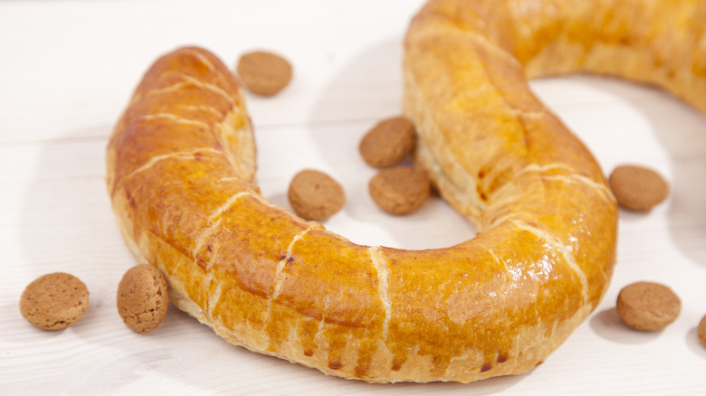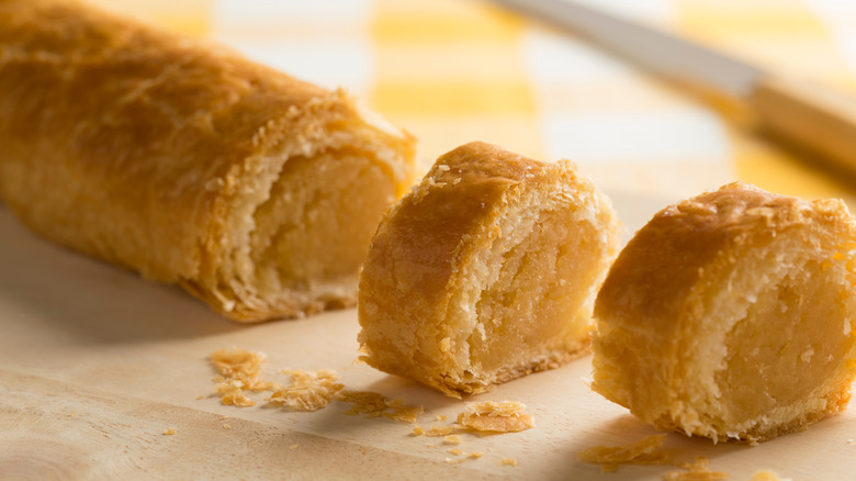 Although wrapping almond paste with various types of pastry dough sounds simple enough, ensuring that the filling doesn't seep out into the oven can be a tricky obstacle for novice bakers. Whether bakers shape them like letters or top them with candied cherries or angelica, it's common for people to enjoy these tempting treats warm, straight out of the oven, and with a steaming cup of tea or coffee. If you're not too worried about fashioning your pastries into shapes, you can roll up easier-to-make logs with sweet almond paste. Add orange zest for a zingy upgrade and bake until flaky and golden.