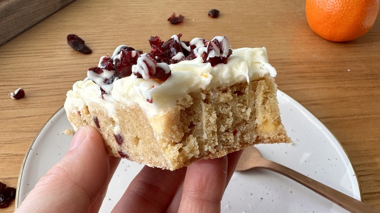 For the topping, cream cheese and butter are creamed together for a rich topping that sets up firm enough for clean slices. Confectioners' sugar sweetens and thickens the mixture, while orange zest and kosher salt amp up the flavor, looping in the flavors of the blondie base for a cohesive dessert. You'll finish off the bars with a garnish of chopped cranberries and a drizzle of melted white chocolate to really hone in on that classic Starbucks look.