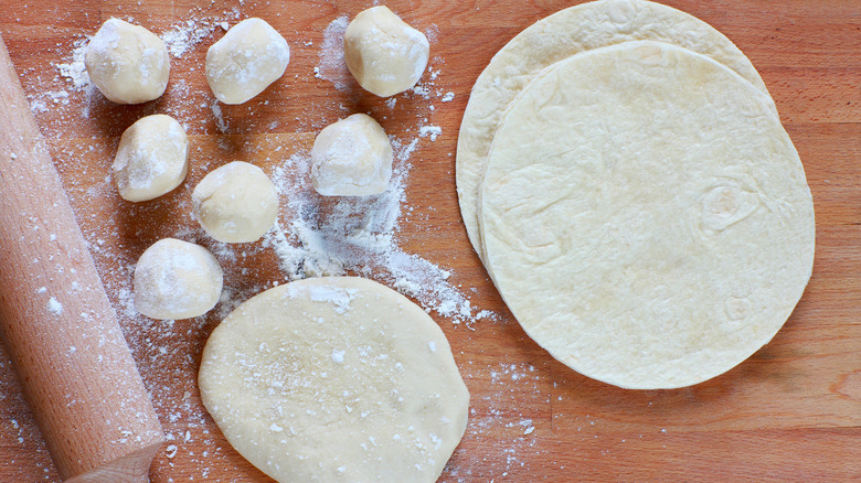 Homemade flour tortillas are a simple three-ingredient recipe but act more like flatbread than corn tortillas. Consequently, they require resting time, kneading, and rolling. The initial blend of flour, water, and fat renders a sticky, tacky dough that you'll knead until it forms a cohesive ball. Letting the dough rest for at least an hour allows the fat and flour to integrate into a smoother ball that will be easier to divide. Once you've divided the dough into individual balls, another 20 minutes in the fridge will give them the perfect consistency for rolling out.